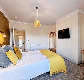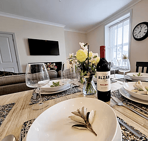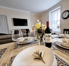 Prepare meals in the luxury kitchen, designed with both style and functionality in mind. The dedicated dining area is perfect for enjoying memorable dinners and socialising. Beyond this, a relaxing living room area awaits with a cosy fire, creating a warm and comfortable atmosphere for unwinding after exploring the local area. Every detail in this apartment has been curated to ensure a truly memorable stay.