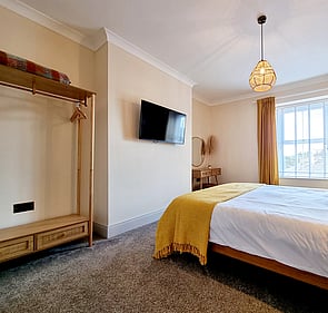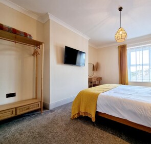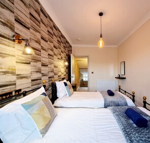Step inside and discover The Last Bank's beautifully arranged sleeping spaces, designed for comfort across two levels. On the first level, you'll find a comfortable double bedroom and a convenient WC. Ascend to the top floor where you'll discover a luxurious king-size bedroom with its own TV, alongside a versatile twin room setup. This flexible configuration ensures ample room and comfort for everyone to unwind.